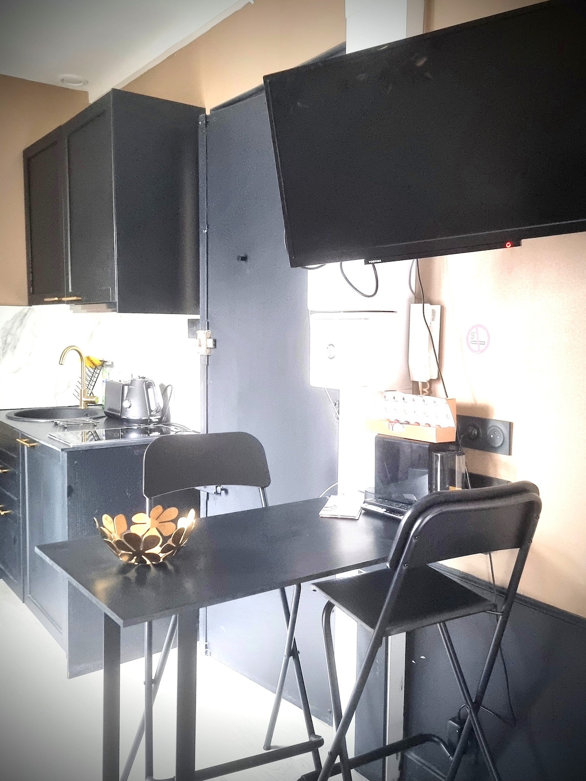 Welcome to Paris ! Dans un magnifique immeuble Haussmannien (escalier by Eiffel), ce petit appartement design vous propose tout le confort & luxe nécessaire pour un séjour d'exception en plein cœur de Paris. L’appartement peut accueillir jusqu'à 2 personnes et offre : - Une pièce à vivre composée d'une cuisine toute équipée dernière génération - Une chambre avec lit rond king size - Un bar en granit Zimbabwe pour vos repas et espace bureau - Un coin salon cosy - Une salle de bain italienne