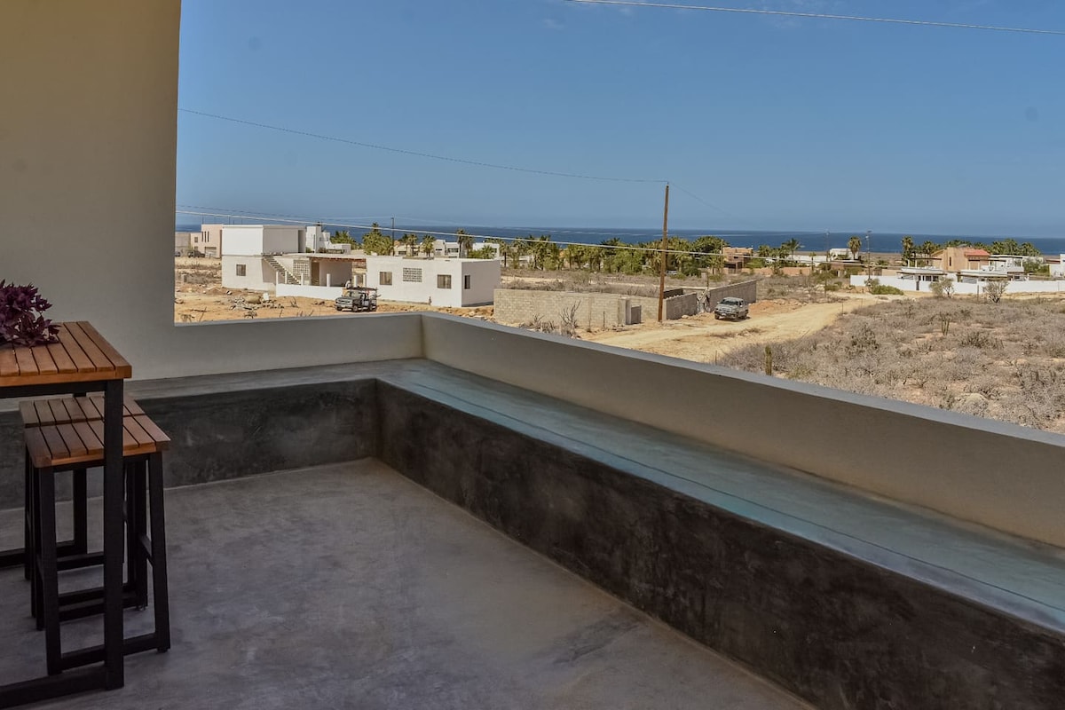 是一間寬敞的套房,配有海濱露臺,可欣賞海浪或享受巴哈最美麗的日落。 五個獨立單位共用露臺。 每個單位都有浴室、智慧電視、可靠的WiFi、空調、衣櫃和辦公桌。 輕鬆前往Cerritos和Pescadero海灘。開車15分鐘即可抵達Todos Santos。 * *房源內有一間名為「Besos de Mezcal」的餐廳酒吧,營業時間為星期二至星期日下午2點至晚上10點。氛圍很好。 為房客提供新的網球場