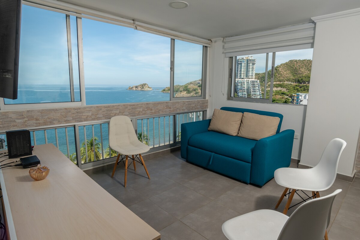 Relájate en este espacio tan tranquilo y elegante.Disfruta cada amanecer y atardecer de una maravillosa vista al mar desde la ventana. Además, puedes encontrar lo necesario para disfrutar de una estadía de descanso y tranquilidad:contamos con lencería tipo hotel en dormitorios y baños, cocina con menaje completo; habitaciones con aire acondicionado; conectividad a wifi , y TV por cable. Estamos ubicados en el corazón del Rodadero, cercano a diversos locales comerciales.