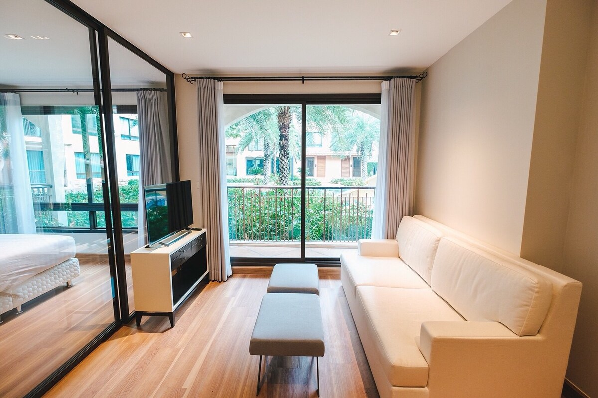 聖華欣山聖殿(The Crest Santora Huahin) 位於華欣7巷。Hin Nam Sai Suay Hotel , 單位39/199 , J棟, 1間臥室, 1間浴室,可容納4人 泳池景觀房。房間面積為47平方公尺。新裝潢的房間美麗、乾淨和獨立。您可以在房間內烹飪簡單的餐點,在包括海灘泳池在內的任何泳池中遊泳,然後步行前往海灘。 ::室內電器和設施:: -一張5英尺的牀,配有寢具 -一張3.5英尺的子母牀 -額外的3.5英尺牀墊(折疊牀墊) - 2臺空調 -液晶電視、DVD、iPod的BOSE聲音底座、iPhone -熱水器 -冰箱 -微波爐 -碗碟、餐具 -可供4人使用的毛巾 - 2瓶水 房客可以使用所有公寓設施,例如: -寬敞的海灘私人海灘,配有海灘派對甲板 -度假村周圍有一個海水泳池,海邊泳池有兒童泳池和按摩浴缸。 -健身房 -兒童中心 -度假村周圍的花園 -度假村內有停車位 -監視器保全系統和24小時保安 -高爾夫接駁 請注意, 價格適用於最多房客人數, 4. 入住時間:下午2點退房時間為中午12點。 禁止攜帶寵物 房間內和房間外的陽臺上禁止吸煙。 華欣7巷,交通方便,距離小巷約300公尺,計劃就在海邊,設計非常好,所有區域都非常方便步行到巷前,有新開業的迷你超市,藥店, Kasikorn泰國的自動取款機和Sri )有餐廳、酒吧、Nang Chit俱樂部和卡拉OK ,巷子對面的酒吧,有PTT加油站, Amesol咖啡, 7-11 ,肯德基,醫院只有很短的路程,還有許多其他地方,如市場夜市、Plearnwan。