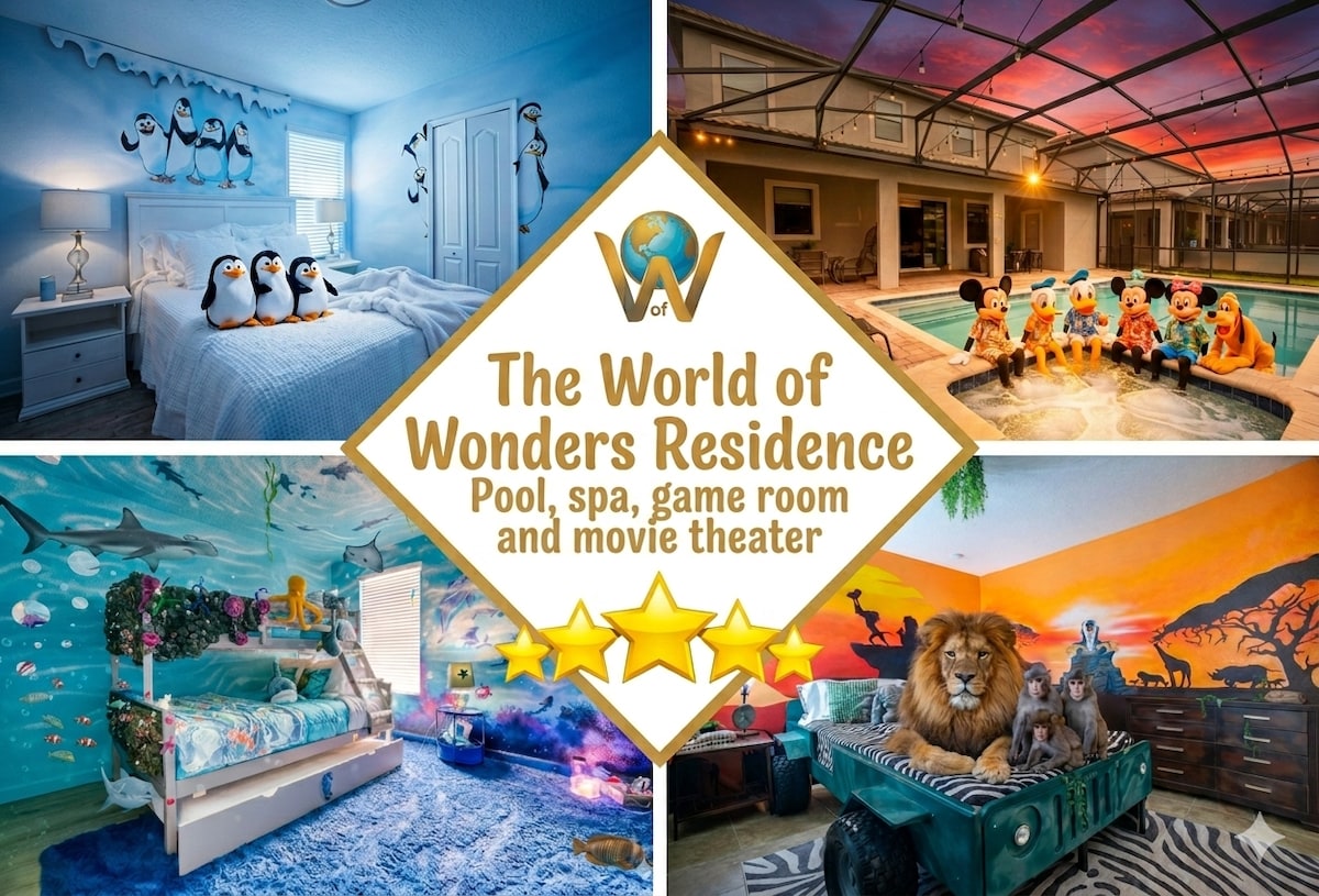 Experience luxury at our 7BR "World of Wonders" oasis. Relax in your private pool and spa after a day at Disney, just minutes away. This upscale retreat features immersive themed rooms, a designer kitchen, and a space-themed game room. Perfectly centered for adventure: drive east to NASA Space Center and Cocoa Beach, or west to Tampa and Clearwater’s white sands. Whether seeking park thrills or coastal sun, enjoy elite comfort and proximity to Florida’s best. Book your dream stay today!