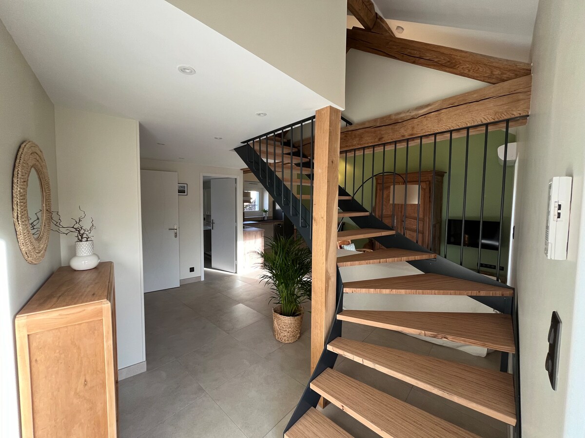 翻新的公寓,設備齊全,可供2人入住,位於Saint-Bris-le-Vineux。 包括明亮的客廳、設備齊全的廚房、舒適的臥室、帶淋浴間的浴室、馬桶和儲物空間。 WiFi、電器和生活必需品。 安靜的位置,距離Auxerre 10分鐘路程,非常適合情侶或釀酒住宿。