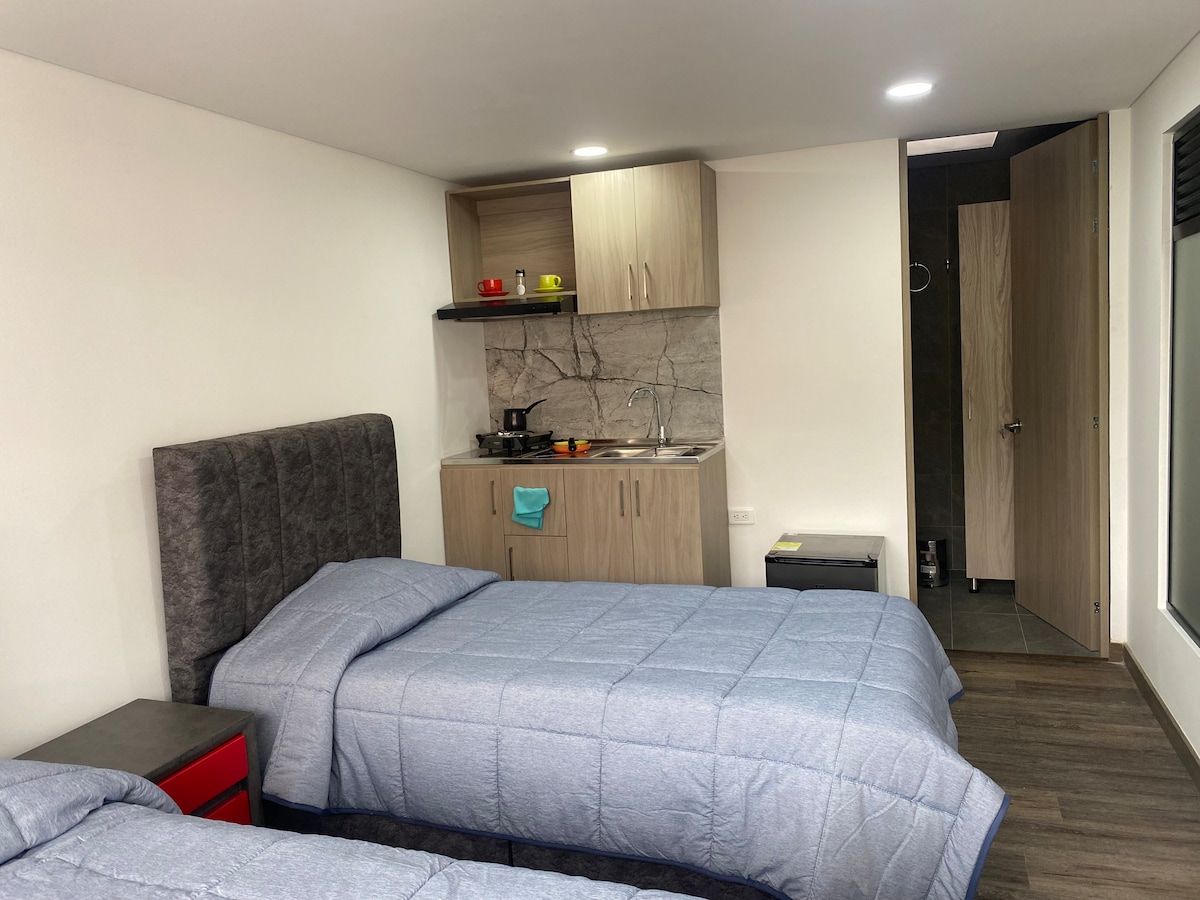 美麗、安靜和舒適的公寓。 地理位置極佳。 它有1間雙人臥室、Wi-Fi、廚房、1間配備熱水淋浴的私人浴室和舒適的工作空間。 距離機場10分鐘路程,交通便利,靠近購物中心、餐廳、公園,是開車離開波哥大的戰略要點。
