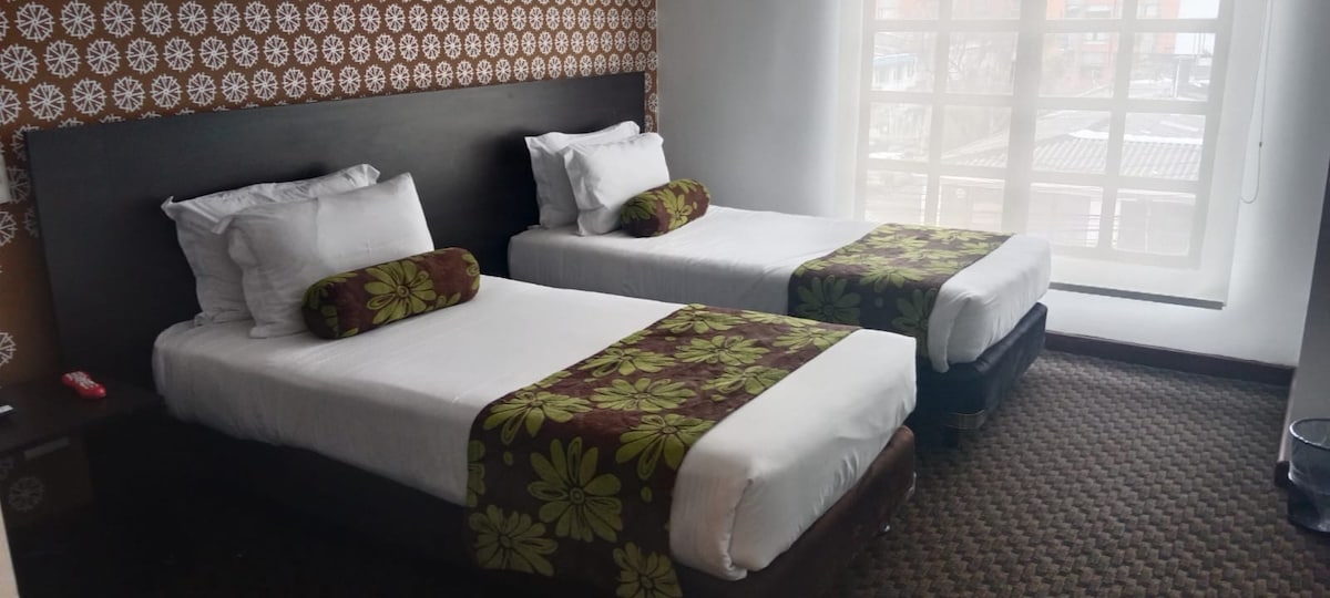 Ideal para amigos o colegas. Con 2 camas individuales, escritorio, baño privado y Wi-Fi rápido. Ubicada cerca de la Zona Rosa y centros comerciales. Desayuno incluido, ambiente seguro y atención 24/7.