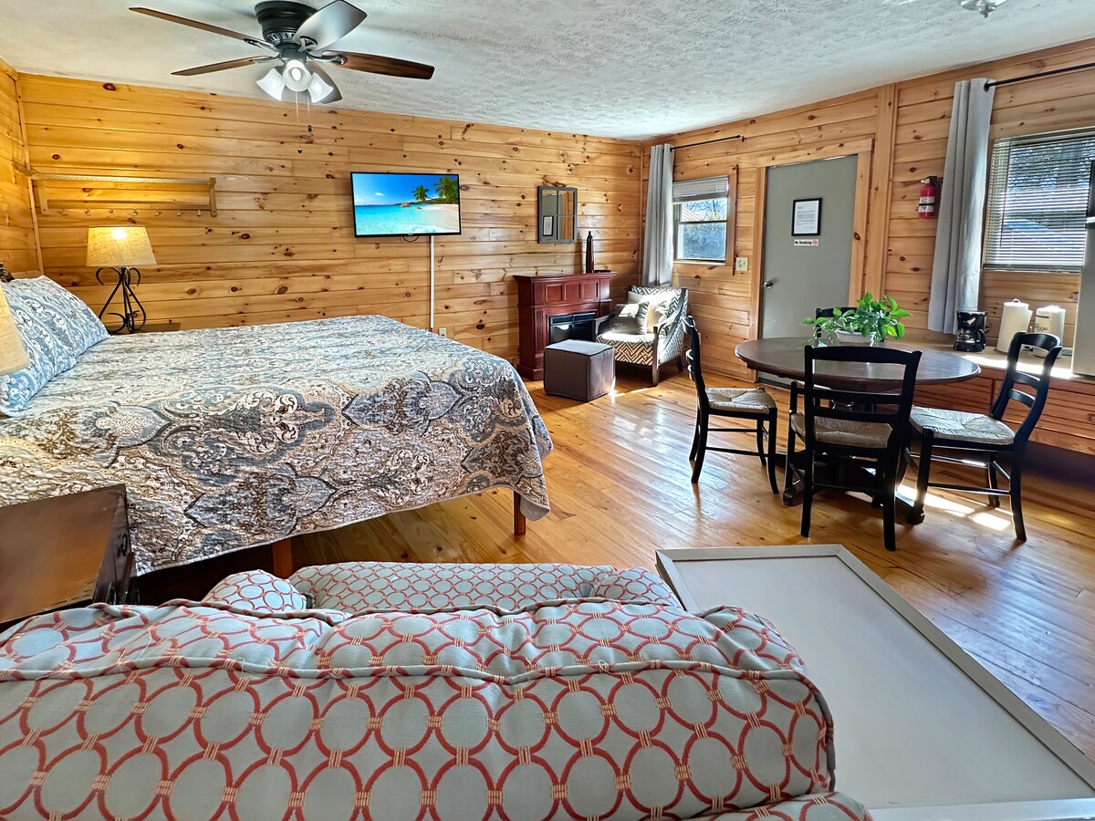 This lodge room is fashioned after a mountain cabin and is very cozy, great for a family of four or friends get away. There are two neighboring lodge rooms which will accommodate larger groups and combined families that will enhance your Blue Ridge Day!