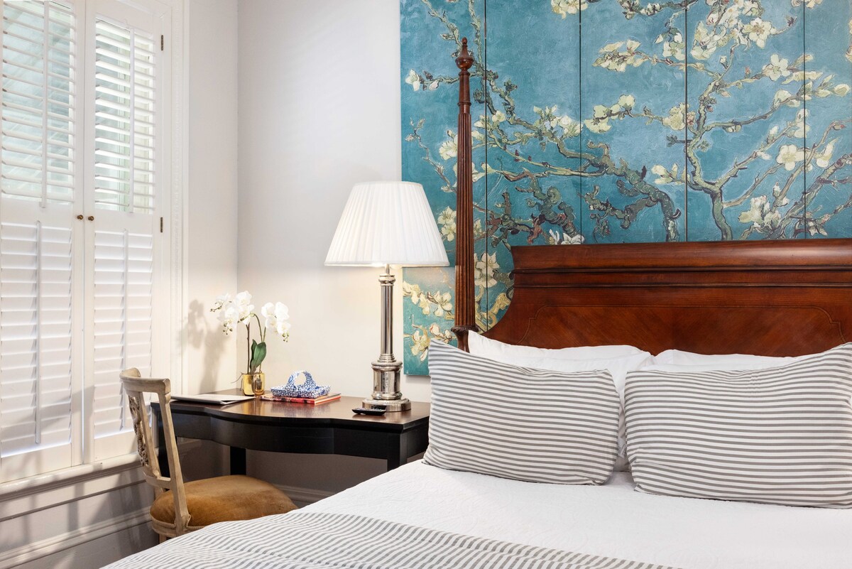 The Putnam Room offers upstairs accommodation at the front of the main Town House Inn. Featuring a queen-sized four-poster bed and charming west-facing shuttered windows, this room provides spacious comfort for singles or couples. The large en-suite bathroom features a single-sink vanity alongside an antique claw-foot tub with telephone faucet and hand shower. Self-service coffee and tea available in the hospitality landing just outside the room.