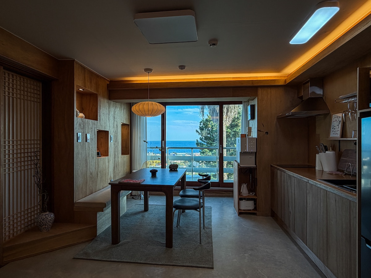 您好。) 位於西歸浦市中心懸崖之上的這個空間,擁有可同時眺望島嶼與大海的永久海景,讓旅人無論白天或夜晚,都能沉浸在濟州獨有的壯麗風景之中,感受海風吹拂與光影流動交織出的靜謐時刻。 客房面積約66平方公尺,為獨立使用的私人空間,與其他旅客動線分離,確保入住期間能完整享受專屬於自己的放鬆與安靜,不受打擾,盡情沉澱身心。 雖為開放式格局,卻提供寬敞舒適的空間配置,臥室、客廳與廚房區域明確劃分,動線流暢而清爽;露台設有SPA設施與烤肉設備,讓您在海景相伴之下實現旅行中的浪漫想像。 您可在無邊際泳池畔,一邊欣賞遼闊海景,一邊悠閒享用早餐,為濟州之旅增添從容與愜意。泳池營運期間為5月至10月;免費早餐於早餐休息室供應,窗外即可將最具濟州風情的大海與虎島風景盡收眼底;屋頂花園則是欣賞濟州夕陽最動人的角落。 這是一處讓濟州風景與休憩時光自然交融的所在,無論與家人、朋友或摯愛同行,都能留下專屬於彼此的溫暖回憶,讓每一次停留都成為值得珍藏的片刻。另備齊餐具與基本調味,簡單下廚也很方便;並提供迎賓茶點與咖啡,讓您一抵達就能慢下來。若需協助,我們也樂意提供在地推薦。也歡迎隨時訊息詢問。都可。謝謝您。