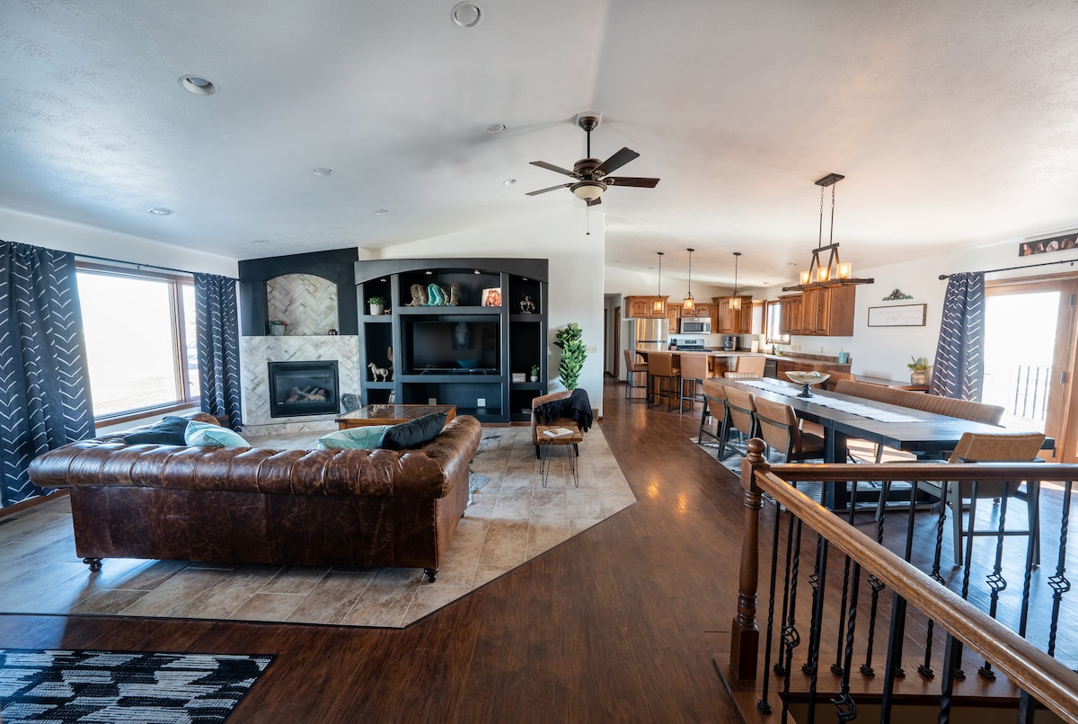 「RVR」是位於鄉村的5英畝寧靜土地,俯瞰蘇河谷,距離蘇瀑市區和I-29/I-90僅3英里;距離桑福德五角大樓和總理中心直線北方4和5英里。房客每天早上都可以從5間臥室、30 'x40'公共區域大房間/廚房、低層英國酒吧和客廳、14 'x40'露台、12'x40'甲板、有蓋甲板、封閉式門廊和12 'x16'後甲板欣賞日出。從這些區域的一半可以看到每次日落的最後一口氣!享受!