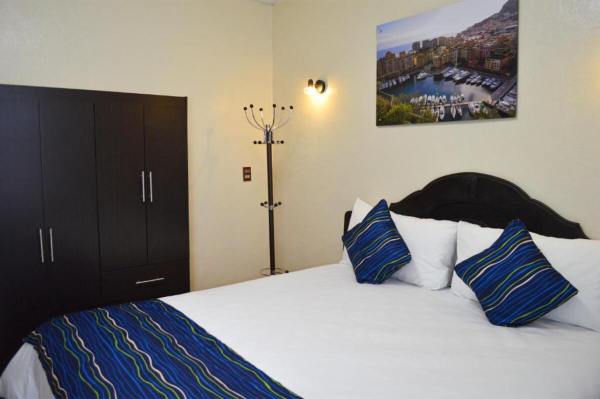 入住這間位於Tuxtla Gutiérrez安靜安全區域的獨立房間,享受舒適的住宿體驗。 這個空間經過精心設計,是休息或商務差旅的理想選擇,為您的健康提供舒適、功能性和貼心的細節。 寬敞明亮的房間,配有雙人牀、空調、吊扇、電視和辦公桌。 配有一張沙發和全身鏡,增加了舒適度。