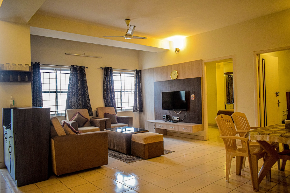 Spacious 3-Bedroom Residence Layout: Foyer, separate living & dining halls, balcony, kitchen with utility. Sleeping: 3 bedrooms, additional cot in common area, and an extendable sofa. Convenience: 3 bathrooms and a dedicated work desk. Essentials: 24/7 hot water, power backup, night security, and daily housekeeping.