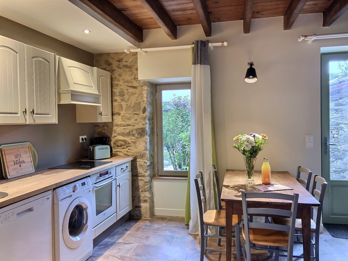Cette maison rénovée à l'ambiance chaleureuse grâce à ses murs en pierres apparentes est composée au RDC de la cuisine et du salon avec son poêle; à l'étage, d'1 chambre traversante, de la salle d'eau , d'1 wc indépendant et d'1 chambre avec 1 lit double en 160. Un espace extérieur privé avec table et un commun agréable avec salon de jardin.Pour votre confort tout est compris dans votre séjour, draps de lit, serviettes de toilette, tapis de douche et torchons. En option panier petit déjeuner.