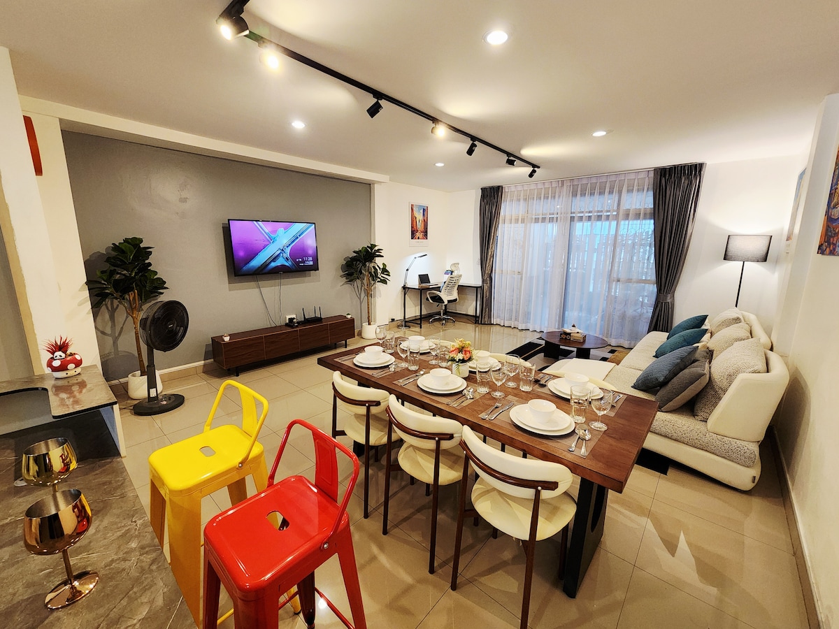 很荣幸被airbnb评为“超赞房东”,我会尽最大努力服务好每一位客人,airbnb上所有照片中设施均为真实拍摄。 🏠【房源介绍】 占地140平米的两层建筑,拥有3间独立卧室和2.5个卫生间,客厅,餐厅,封闭厨房。适合3-6人入住,适合亲子家属朋友旅行。在厨房空间,你将获得全套餐具,与亲朋好友一起烹饪美食。 该房源位于小区泳池的右侧。房屋有两层,两层房屋各有2.5个干湿分离的卫生间。房屋二层拥有三个臣室,一个主卧两个侧臣,共可以容纳6人居住。房屋配备无线网络以及无限网络电视,厨房配备厨具以及洗衣机。房屋门口便可无障碍停车。 小区出门200米有7-11便利店,便利生活非常快捷。并且可以使用Grab出行和点外卖。