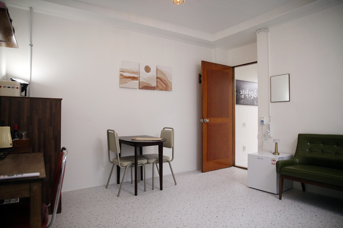 距平澤站(Pyeongtaek Station)3分鐘步行路程 多個拍照區/復古風格1981/1981感覺! /各種全方位設施/各種便利店/商店概念照片區/漫畫室/經典遊戲機房等。如果你想要一個有趣的體驗,我希望你可以來這裡! 選項: 雪櫃/冷氣/洗手盆/Q尺寸床 書桌/椅子/電熱水壺/風筒/55吋電視 OTT服務/廁所/照明/手機充電器/衣架 電熱地板/沙發/餐桌/密封盤 電子門鎖是Wi-Fi的,所以每次都會給出不同的密碼,所以你進出時都會輸入一個沒有人知道的密碼。 它有一扇大窗戶,所以是一個通風良好和舒適的房間。 無論你是短途旅行或長期住宿,我們的旅居都能為你提供舒適、享受和過去的空間。 立即預訂,享受現代便利和懷舊的終極復古體驗!