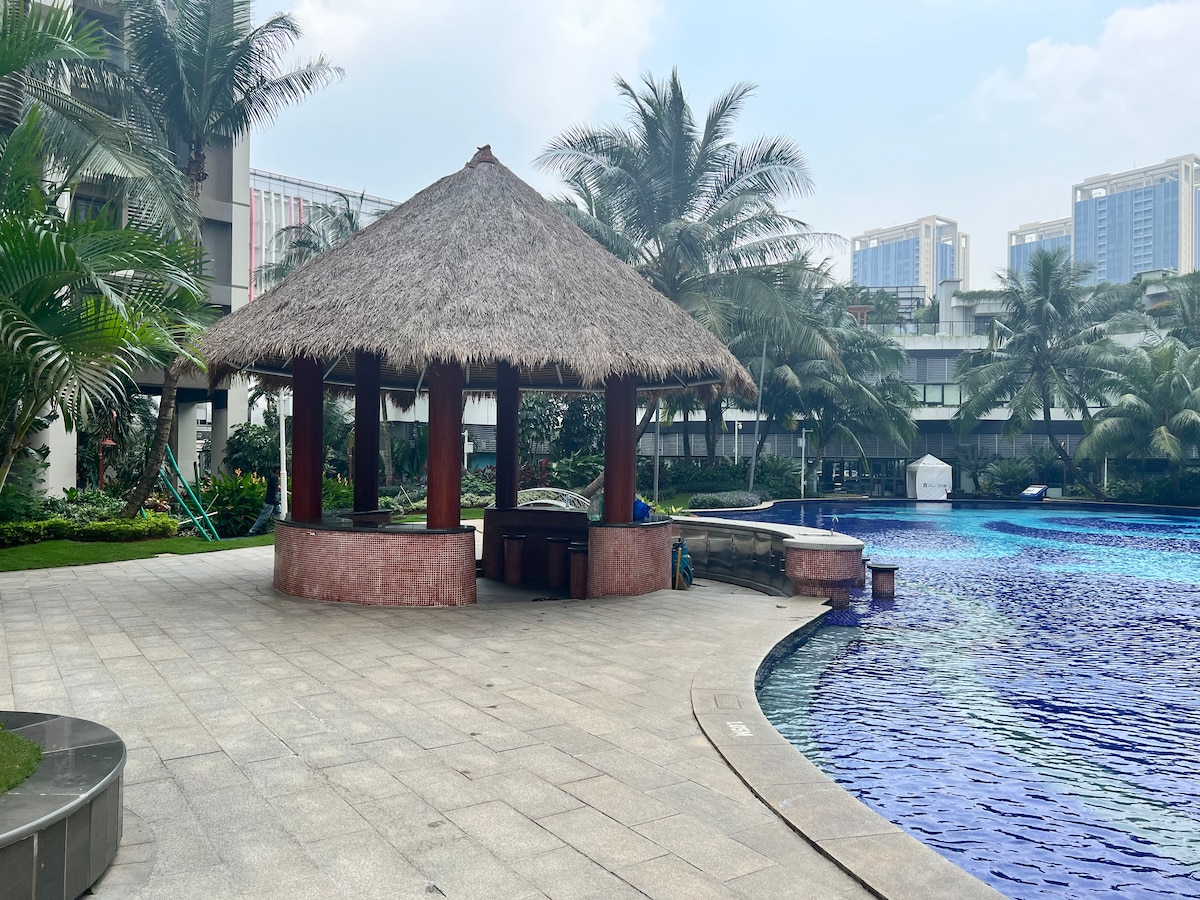 非常適合家庭住宿、觀看活動或音樂會。狀況最佳,全新裝潢,配有全木地板和專用工作站。 位於BSD的中央商務區,毗鄰Aeon Mall (獨家通道)和收費公路。 開車/搭乘Gojek前往ICE BSD、QBIG、微風、極限公園、高爾夫球場等僅需5分鐘。 免費 WiFi、Netflix 和優質 Youtube。 令人驚嘆的放鬆設施、非常好的泳池、兒童泳池、遊樂場、健身房、桑拿房、按摩浴缸和卡拉OK。