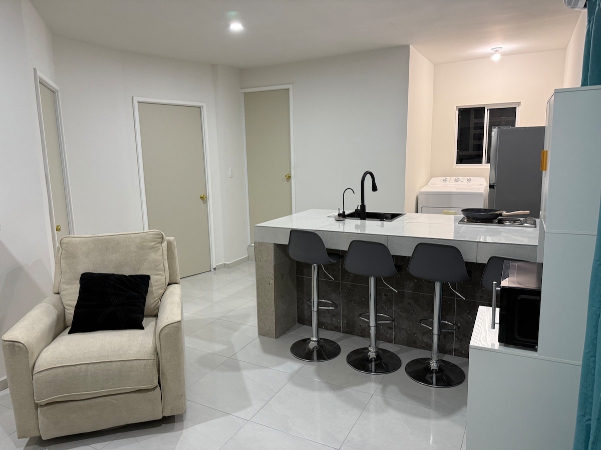 Departamento en lugar muy tranquilo y seguro con una hospitalidad atendida al momento que tu requieras estamos para servirte en lo que ocupes y el tiempo que necesites Tu familia estará segura en estos departamentos de todo si te hospedas en este alojamiento céntrico. Ubicación inmejorable: a solo 2 minutos caminando de Gutiérrez, Soriana y Walmart. Todo lo que necesitas está cerca: Oxxo, restaurantes, centros comerciales, Telcel, ferretería, iglesia, escuelas de todos los niveles