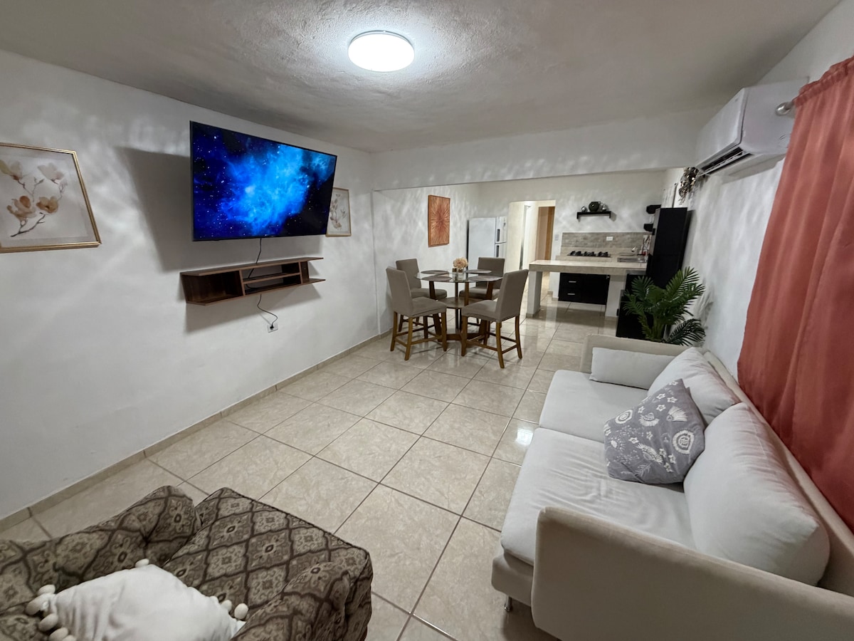 Disfruta de la sencillez de este alojamiento tranquilo y céntrico. • 2 habitaciones amplias con camas cómodas y pantallas para que disfrutes tu estancia • Sala acogedora con TV y WiFi gratuito • Cocinita equipada (refrigerador, estufa, microondas, utensilios) • Baño completo con agua caliente • Lavadora y secadora en el alojamiento • Aire acondicionado y buena iluminación natural