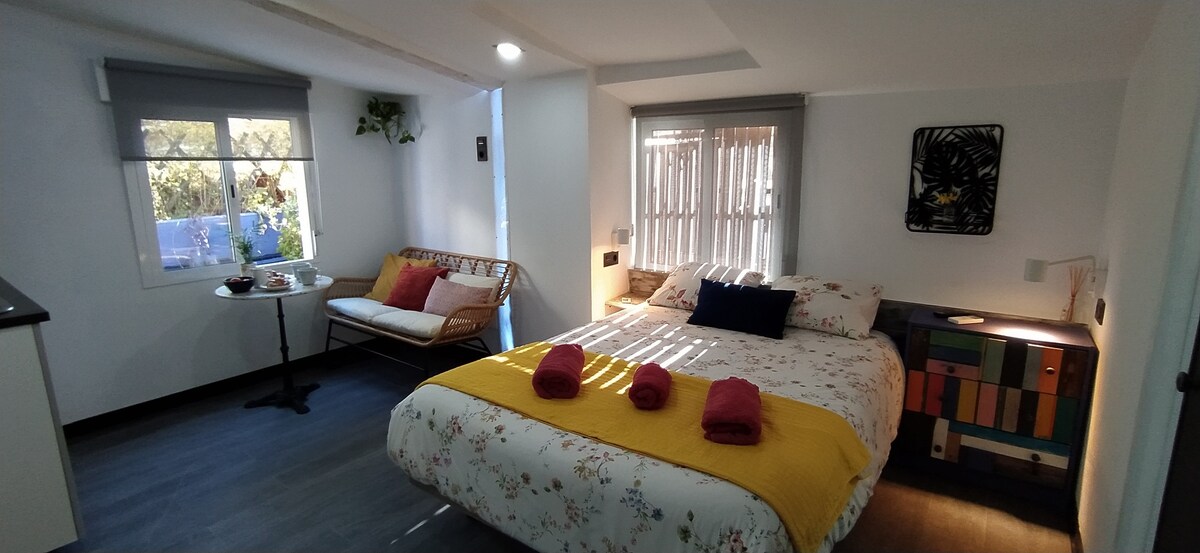 Habitación SUITE impresionante terraza privada, en la que después de un día de turismo por Madrid , podrás descansar, relajarte tomando un vino o café... Disfrutar de una ducha al aire libre y desayunar al fresco además de tomar el sol en una cómoda tumbona, en invierno hay estufa de leña de exterior eso le hace aún más cálida y acogedora. La habitación cuenta con todo lo necesario para pasar unos agradables días. Hay metro y autobuses q te llevan al centro directamente sin transbordo