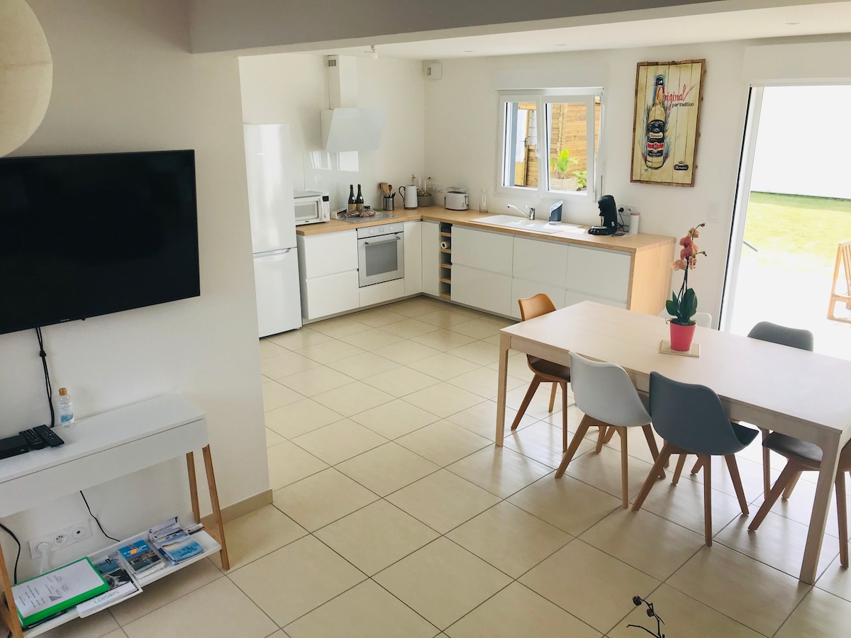 我們翻新了這座屬於我們祖父母的農舍。周圍環繞著田野和草地:保證安靜!從房源出發,沿著公路走 4 公里即可抵達海邊,直線距離更近,您醒來時就能看到大海。歡迎您的毛茸茸朋友,只要他們能與我們的動物和平共處。小屋與我們的房子相鄰,有私人通道和戶外空間。