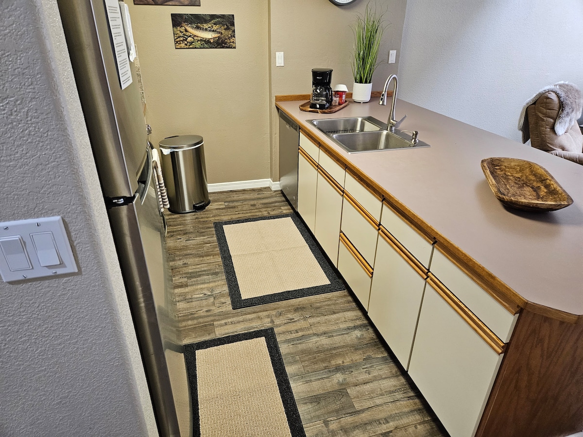 2 間臥室、1-1/2 間浴室。樓下遊戲室。距離村莊6英里,位於一個很棒的林地上,景觀非常好,靠近滑雪場。 樓上有加大雙人床臥室、1/2浴室。主樓層有廚房、獨立用餐區、帶燃木壁爐的客廳、帶大床的臥室、全功能浴室和洗衣設施。很棒的露臺和丙烷烤架。房子外面有一個遊戲室、撞球桌/乒乓球等,還有圍欄院子可供狗狗使用。智慧電視、Wi-Fi。 82號公路旁的一條路