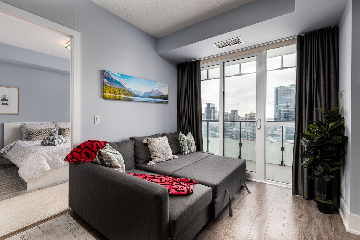 從您的房間到地板到天花板的全景窗戶,驚嘆於多倫多輝煌的城市氛圍。 這間1間臥室的公寓經過專業設計,有現代化的裝潢。 你一定會喜歡我們為你準備的空間。 在配有戶外傢俬的私人露台上放鬆身心,欣賞城市景觀。 每位旅人退房後均經專業清潔。 100%私人和不共享的整套現代化公寓單位。 安全、可靠且簡單的自助入住程序,提供24小時全天候保安服務。