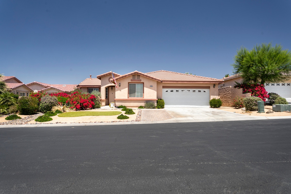 豪華底層別墅,毗鄰大使館套房酒店。步行即可抵達餐廳和餐飲、沙龍和服務、適合家庭的活動、購物、夜生活,距離科切拉音樂節、Stagecoach、印第安威爾斯網球場和度假村高爾夫球場僅幾分鐘路程。 您一定會愛上我的房源,因為這裏的戶外空間、社區、舒適的床鋪和廚房都很棒。我的房源適合情侶、獨自冒險者、商務旅客和有小孩的家庭。