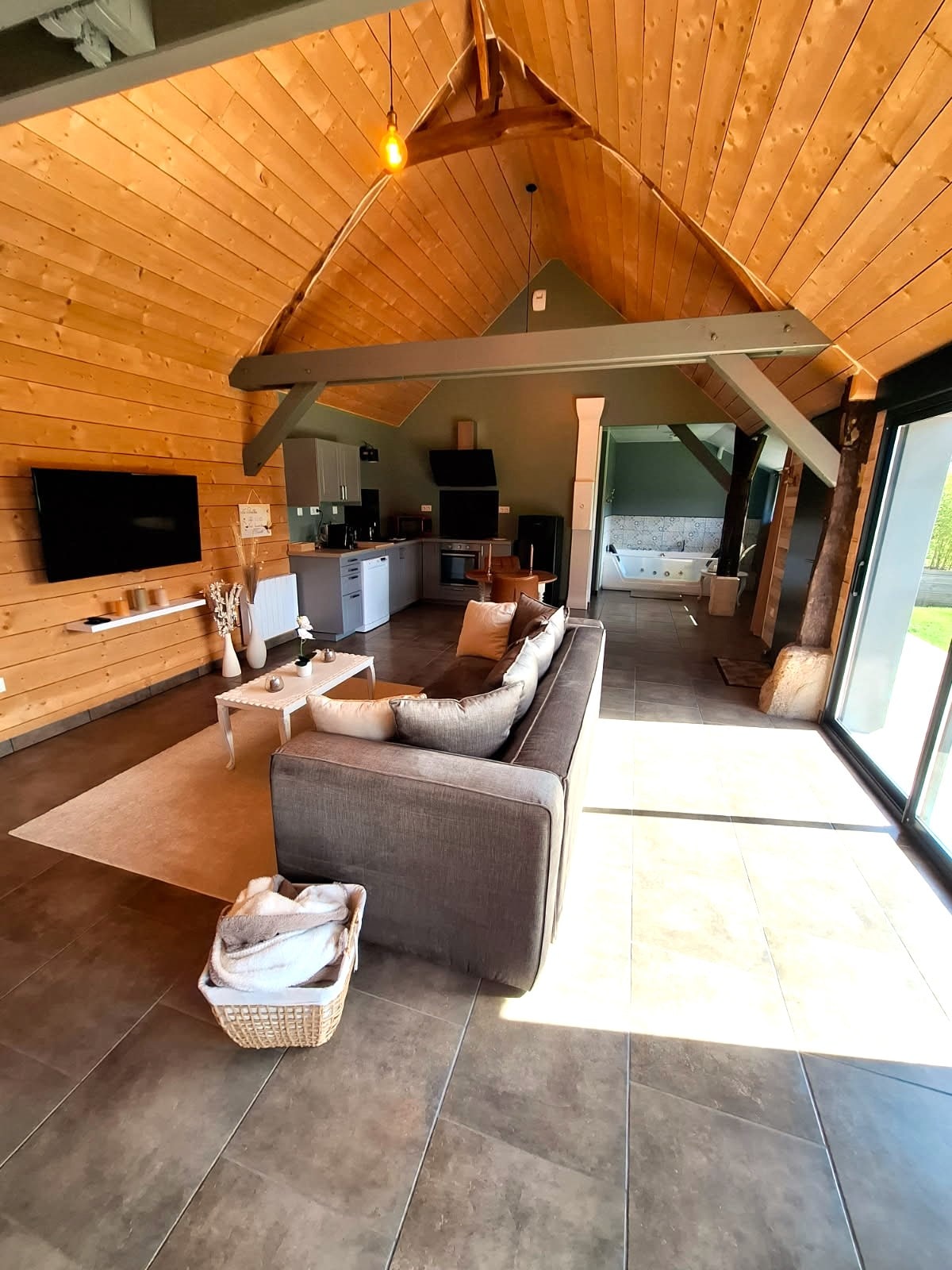 探索我們位於巴黎和多維爾之間的康什-恩-烏什市中心的浪漫套房,距離埃夫勒20分鐘。 位於餐廳和商店附近。 距離 100 公尺處有一個小型停車場,設有電源插座。 這間獨特的住宿提供一個燈光柔和的廚房-客廳、一個帶有植物水療和雙淋浴的浴室。 樓上有一個放鬆區,配有桑拿房、躺椅和按摩桌。 一間臥室,配有一張加大雙人床和一面大鏡子。 ++鞦韆和床鐐++