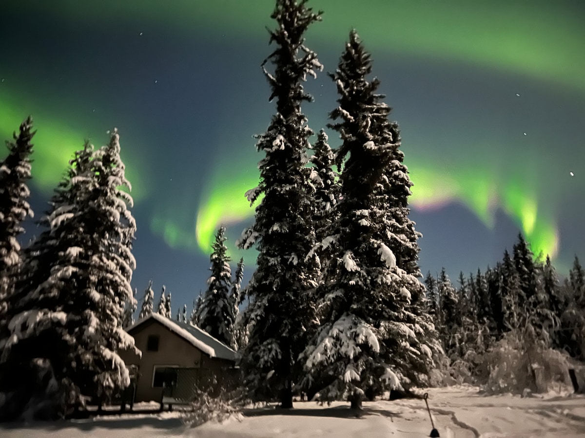 從這個可愛的小木屋探索金心城!坐落在Goldstream的山丘上,您會覺得自己深入荒野,但距離城鎮只有10分鐘路程。您會覺得自己是真正的阿拉斯加人!看不到鄰居,感覺很平靜。 走到門廊外面,一邊喝咖啡,一邊聽著狗拉雪橇隊的嚎叫聲。您很有可能會看到松鼠、鳥類,也可能是青蛙!如果你夠幸運,你可能會看到北極光。