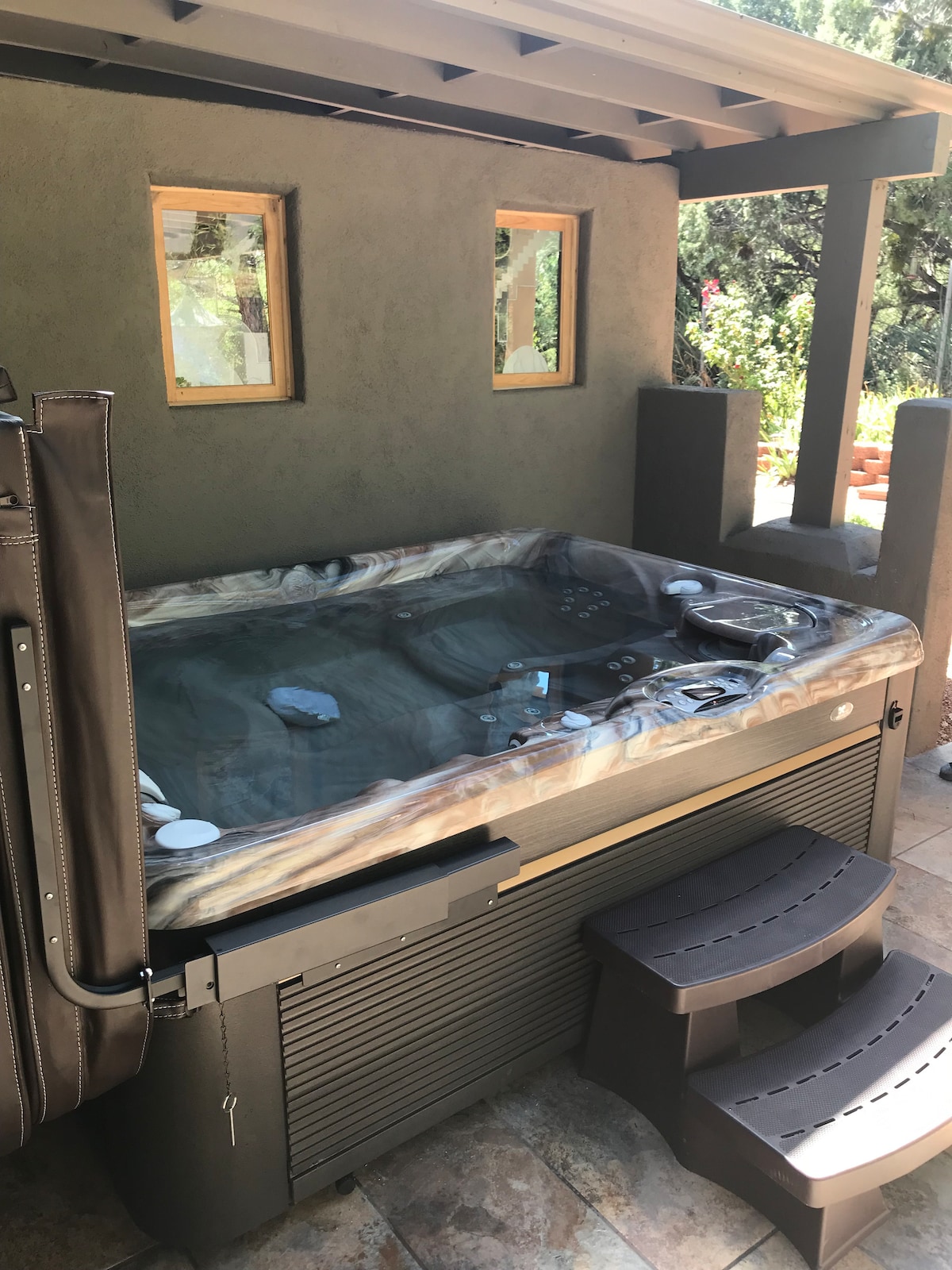 度假村般的後院,配有溫水泳池和家庭劇院