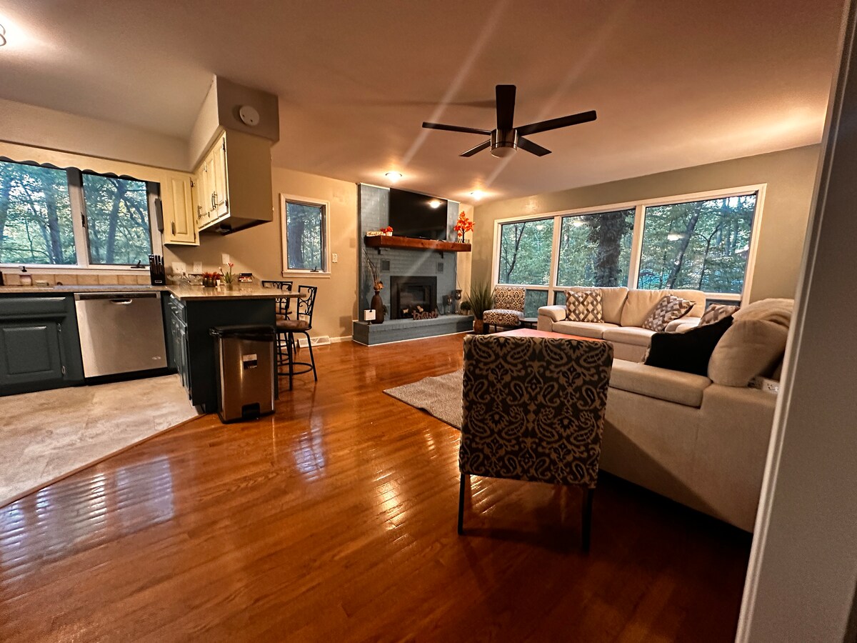 此房源有4間臥室和3間浴室。 距離密蘇里大學校區僅1英里多。 它有一個露臺,可欣賞房子後面的森林景觀。它有高速WiFi,適合串流或工作。 附近還有幾家餐廳。 我們在房源內提供一本指南,其中包含許多資訊,可協助您有個愉快的住宿體驗。 如果有空房!! 提前2小時入住- $ 25 提前4小時入住- 50美元 延遲退房-每小時 25 美元