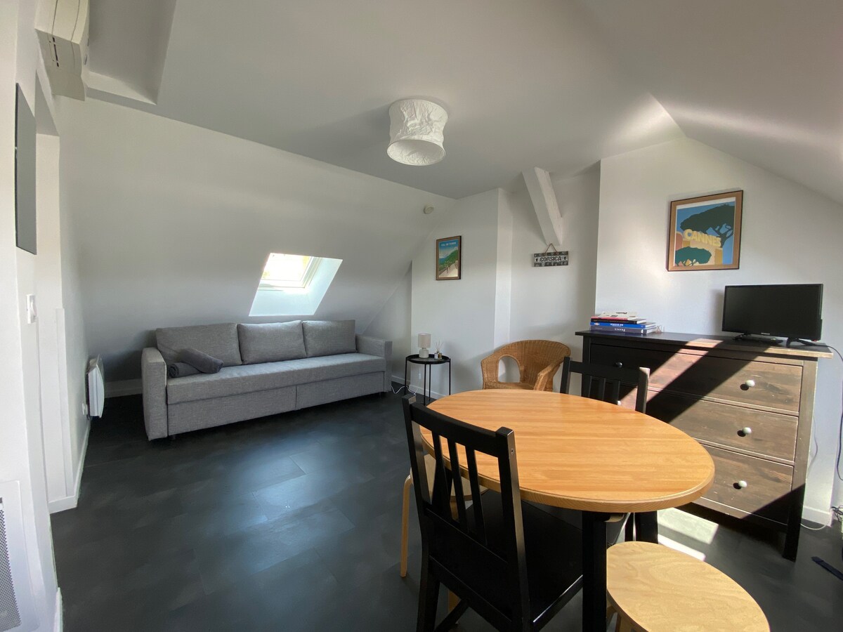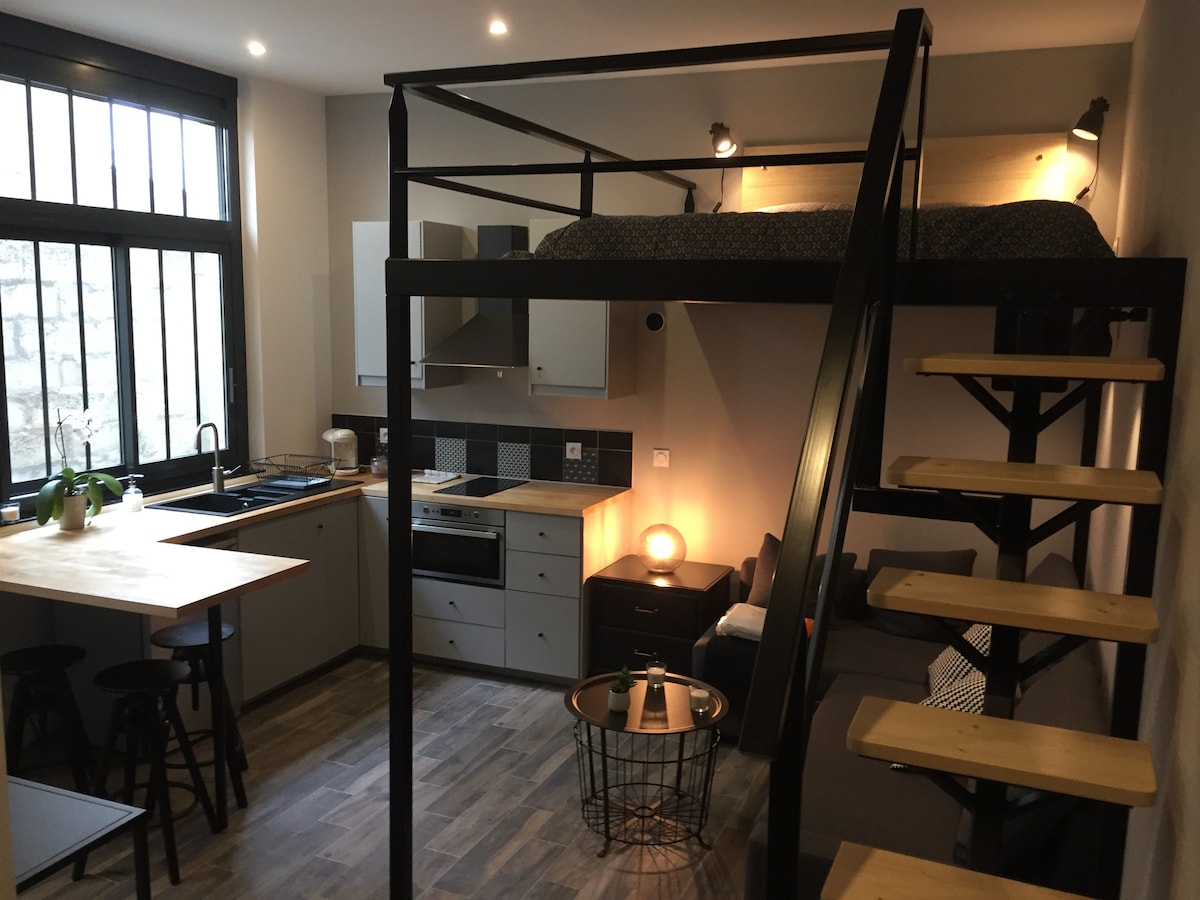 請閱讀完整的公告 「L'Atelier」單間公寓, 位於拉尼河畔 (Lagny sur Marne) 的中心。面積約 25 平方公尺。全新翻修。開放式廚房、夾樓下的休息區、淋浴間、廁所。夾層可睡兩人,硬床墊 140x200。沙發可變成 140x200 的床鋪,並配有舒適的床墊。