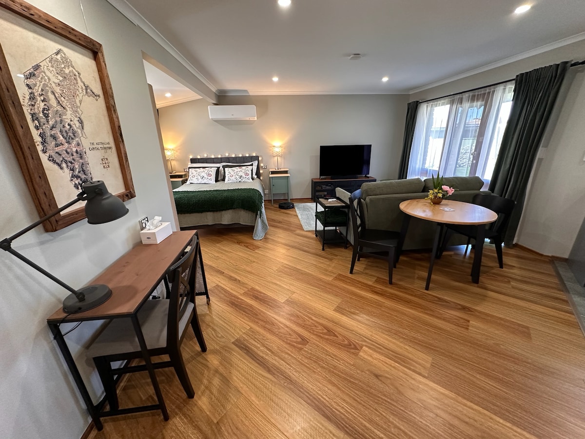 Fully self-contained & private accessed master with walk-in closet/kitchenette to spacious ensuite. - Queen bed - Desk area with USB & USB-C ports - Free WiFi - Smart tv access to Netflix, Disney - Kitchenette: bar fridge, microwave, air fryer, kettle, toaster, airfryer - Iron & ironing board - Bathroom toiletries - Reverse heating-aircon Perfect place for work trips, family visits or day-trips to the snow! Winter season - 1h 50min drive to Jindabyne, 2h20min to Perisher Ski slops.
