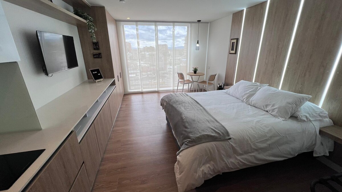 豪華一間臥室,位於波哥大(奇科)最獨特/安全的區域,步行即可抵達最好的餐廳、購物中心,靠近許多商家。 行政住宿,配有專屬工作空間、私人露臺、自動壁爐、可靠的WiFi、私人停車位和大樓保安。 設備與服務:享受美麗的全景露臺,配有壁爐和戶外烤架。 您也可以在桑拿房或蒸汽房玩壁球和放鬆。