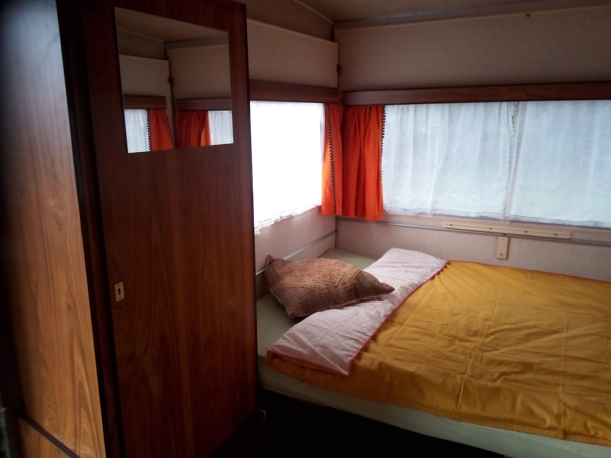 Caravane tout confort pour 2 personnes, avec possibilité d’ajouter un couchage supplémentaire. Elle comprend un lit double, l’électricité, des prises, un chauffage d’appoint, ainsi que les draps et serviettes fournis. Le logement s’inscrit dans La Cabane des Artistes. Les espaces communs (cuisine, sanitaires et jardin) sont partagés et proposent une mini immersion dans l’univers d’une loge de cabaret, chaleureuse et conviviale.