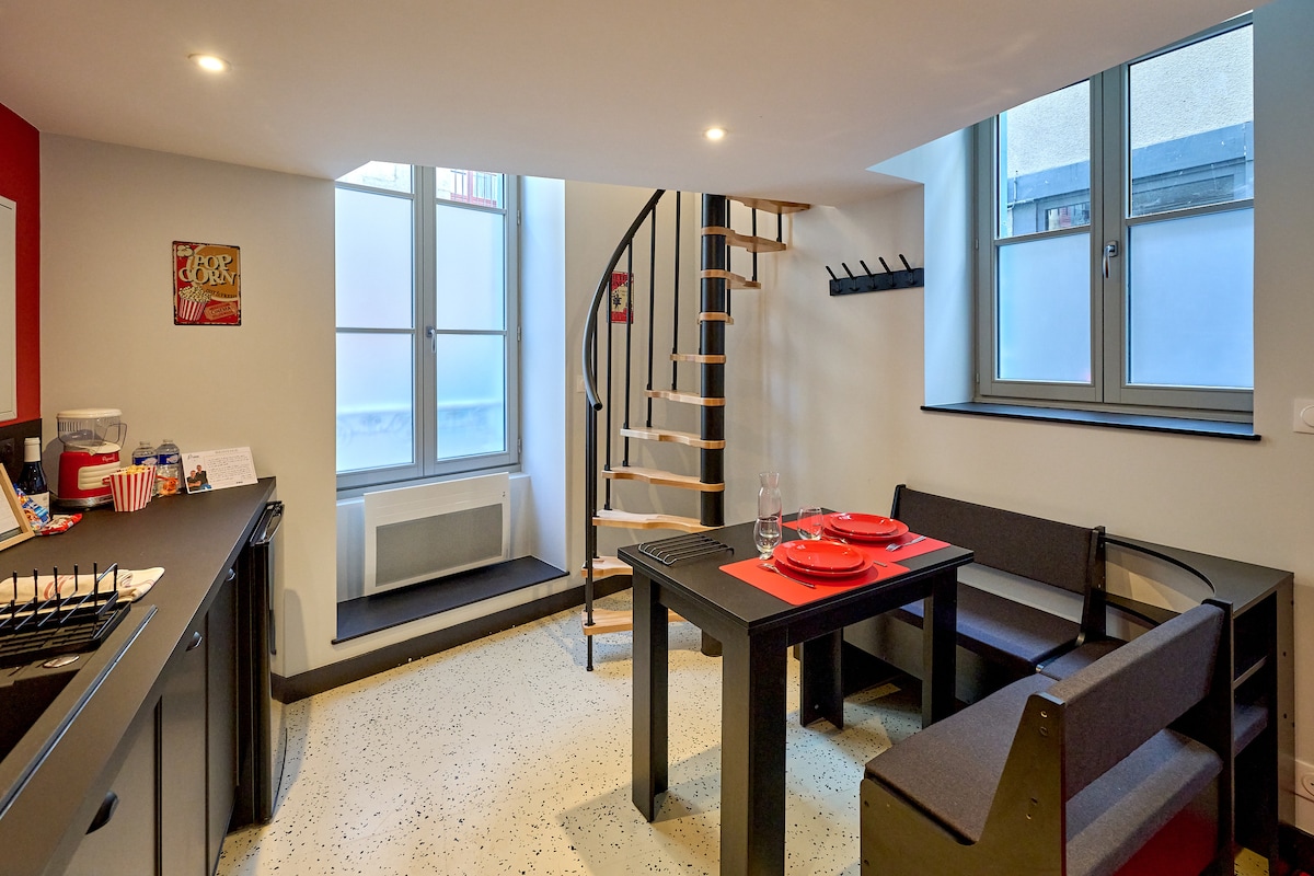 Joli Duplex de 27 m2 entièrement rénové mêlant moderne et ancien. Il bénéficie d'une pièce avec salon, salle à manger et cuisine équipée, d'une salle de bain avec douche, d'une chambre à l'étage et d'une terrasse (vous risquez d'y croiser Suzie notre adorable chien). Vous y trouverez du parquet ancien et un carrelage d'époque. L'appartement est attenant à notre maison. Situé en centre ville dans le quartier Colbert, à 2 minutes à pied de l'hyper centre. Parking gratuit à 1 minute à pied.