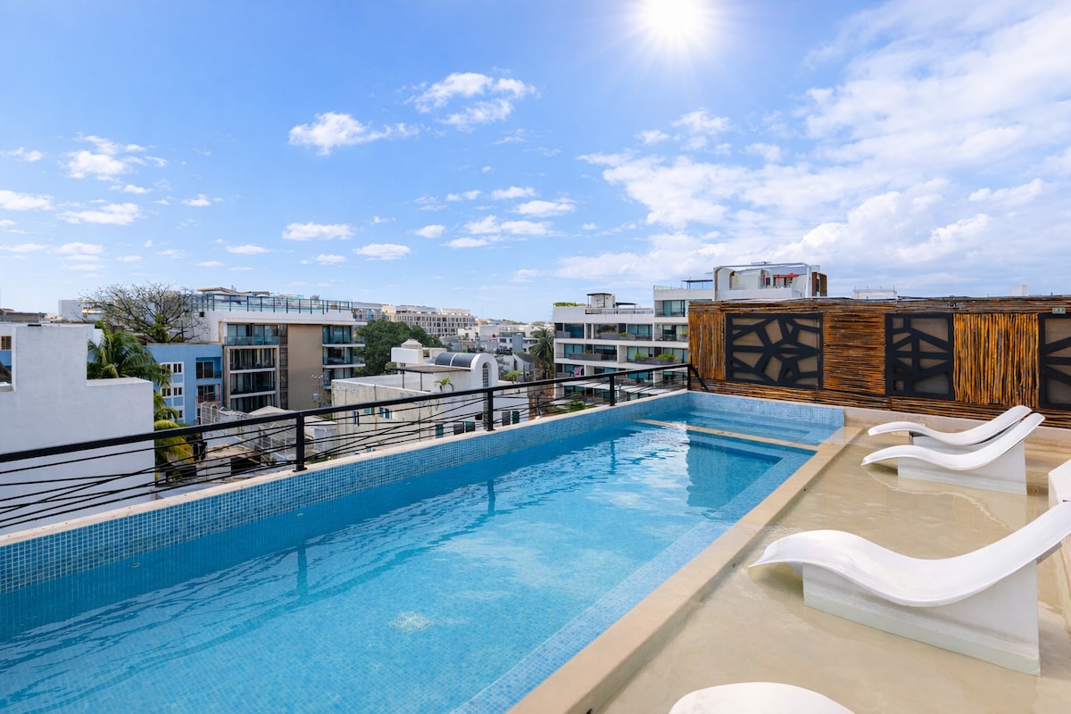 歡迎來到我們位於閃亮的新公寓的舒適單間公寓,就在熱鬧的第五大道旁。房源設備齊全,讓您感受像回到家一般的舒適。此外,從我們的屋頂泳池欣賞加勒比海的景色,無與倫比。這是放鬆和享受陽光的完美地點。來和我們一起享受一小片天堂吧!