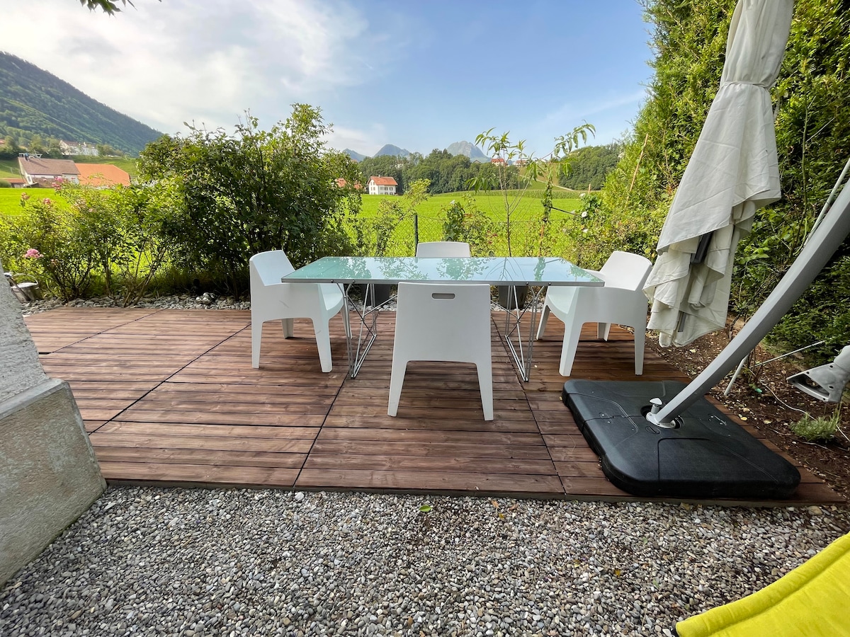 在我們的家中, 獨立入口可俯瞰花園。 步行5分鐘即可抵達村中心(有商店和巴士站)和森林。 開車5分鐘即可抵達Lac de la Gruyère、Bulle鎮和高速公路。 一個簡單、樹木繁茂、安靜的空間。