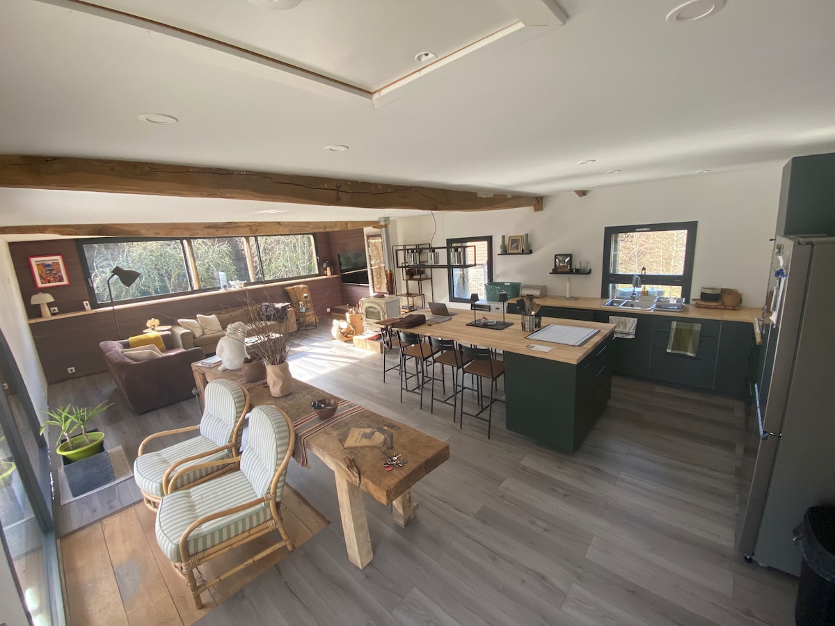 這家麵包店於2021年翻新,採用生態材料翻新。 旁邊是一條田園詩般的小溪,在一個非常大的花園裡,還有另一棟房子和一個穀倉。 一樓有16平方米的大起居區,配有小廚房、木爐和浴室。 淋浴。或者,起居區可以變成一個可供兩人入住的睡眠區域。 閣樓上有一張雙人牀墊,最多可供4人入住。
