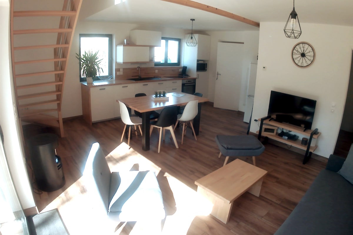 在一間舒適的新小木屋旅居內,步行即可抵達。 非常安靜、私人的露台和花園,南面/西面面向山谷的絕佳全景。 步行600米即可抵達休閒基地和村莊中心,公共停車場。 1間主臥室、1間可供1名兒童使用的可調式房間、電視、Wi-Fi、浴室/廁所。 廚房:爐台、烤箱、微波爐、雪櫃/冷凍爐、拉克萊特機、攪拌機、水壺、咖啡機。