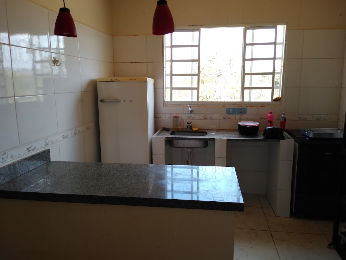 房子配有全休閒泳池和燒烤架。 房子距離臥室040站5公裏,可供休息,然後遵循折扣旅程。 高牆和封閉的大門。 房源距離巴西利亞機場40分鐘路程。 房子有約60米的內部區域,有廚房、浴室、4竈爐竈和基本的廚房用具,因此可以準備餐點。 旅客視為房客,每人每晚價格為R $ 55。