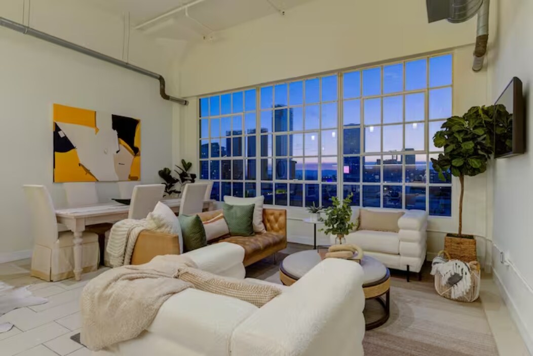 入住這間大膽的高天花板 DTLA Loft 空間,體驗傳奇般的生活,這是你在其他地方找不到的!深藍色的牆面、落地窗簾和超過 30 位音樂偶像的畫作牆,營造出純粹的搖滾風格後台休息室。金色與緞面質感讓臥室更加迷人,彷彿置身於自己的後台更衣室,而沙發床則能為你提供額外的舒適感。智慧科技、360°屋頂泳池、全功能廚房、室內洗衣房和免費安全停車位,讓您的市中心體驗更加完美。