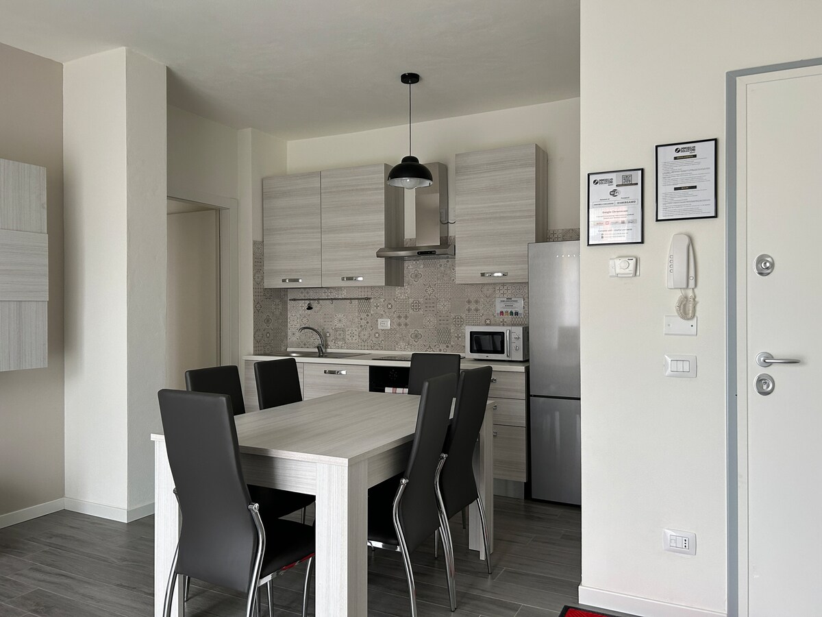 Elegante appartamento a 1.5 km dall'aeroporto di Orio al Serio BGY, vicinissimo al centro di Bergamo, ad Orio Center e alla Fiera di Bergamo. L'appartamento dispone di una camera con letto matrimoniale, soggiorno con divano letto a due posti, cucina attrezzata, fornelli a induzione, microonde, bollitore, macchina del caffè, tv, wifi, climatizzatore in camera e in soggiorno, bagno con doccia, phon e lavatrice. Self check-in e colazione offerta da noi. Parcheggio disponibile su richiesta.
