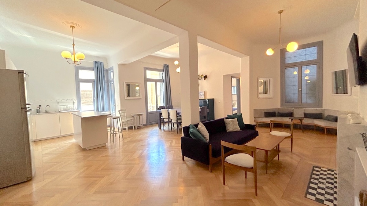 The apartment is located in the center of Piraeus and next to the port. Metro, airport connection, ferries, train, suburban train, bus station and tram all within 100 meters. Central location!! The apartment you are going to stay in is brand new and fully renovated with bedroom, kitchen, living room 69 square meters with high standards and designed by an excellent architect. Located on the 4th floor. It is comfortable and luxurious to make your stay unforgettable!