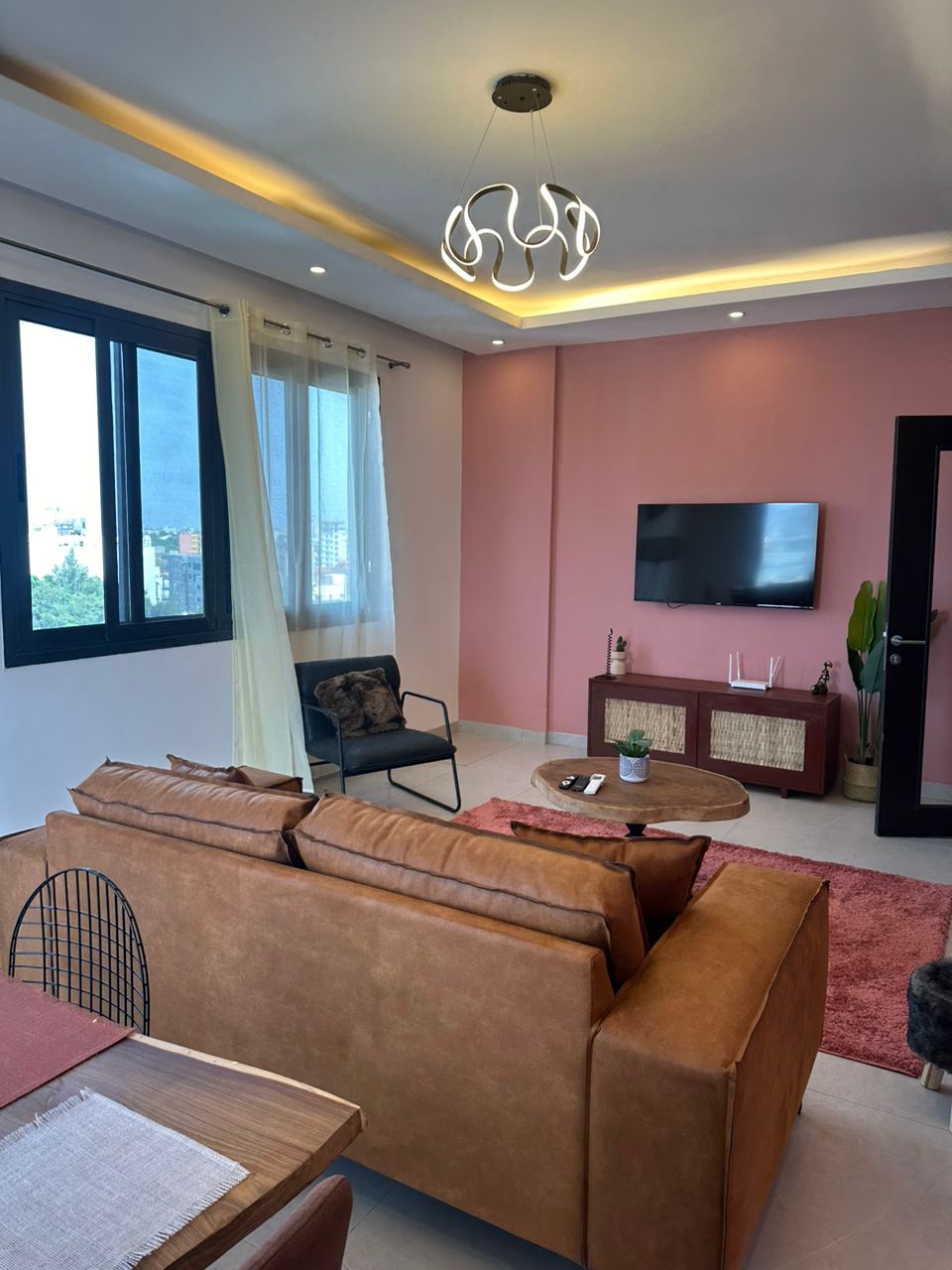 Oubliez vos soucis dans ce somptueux appartement se trouvant au 4ème étage avec ascenseur dans une résidence sécurisée. Sa décoration époustouflante vous fera apprécier votre séjour dans un confort total.. L'appartement est totalement climatisé, équipé de deux grands salons, d’une Smart TV 4K, de la Fibre optique, Netflix, Canal, un service de gardiennage assuré 24h/24. Un van en location peut être mis à votre disposition pour vos transferts à l’aéroport mais aussi pour vos déplacements.