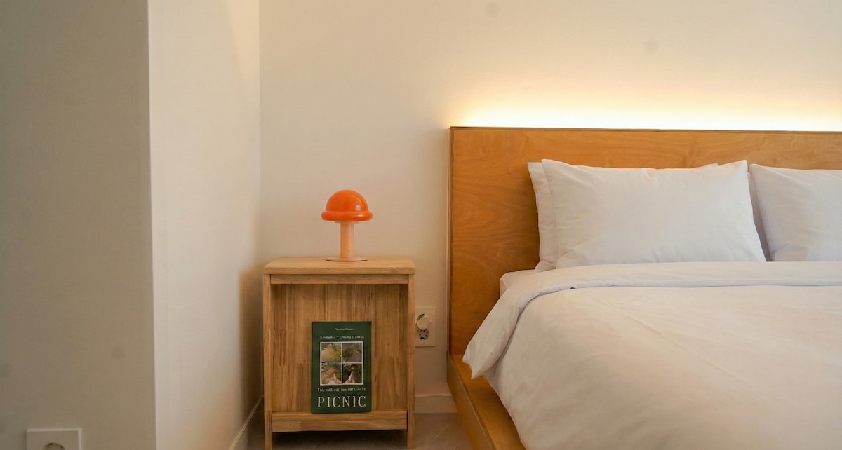 「復古的溫馨氛圍,時間似乎靜止不前,現代經典刺繡的精緻光芒在其上閃耀。」 HABENU東川的頂級國王是一個比輝煌更接近「深度放鬆」的空間。 沉重的木色家具帶來的平靜穩定感喚起復古感覺,彷彿置身於舊圖書館,而天花板上的吊燈則為空間增添了現代優雅感。 無論是為親朋好友準備,或是自己獨享,這間客房的獨特質感都會為你帶來超乎想像的體驗。 探索大邱市中心最性感的隱蔽之處,感受高級特大床的氣氛。