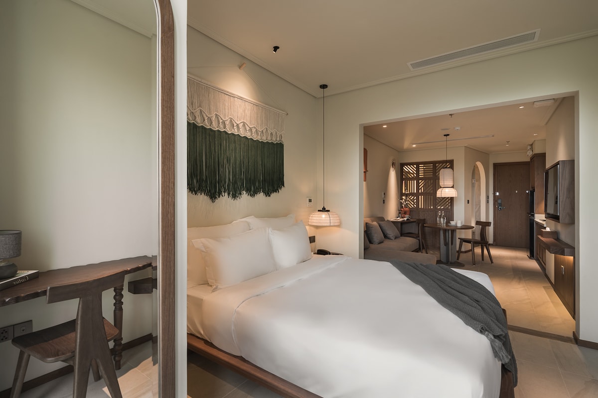 This studio is located at Sunset town (28m2). As a startup host, I’ve put a lot of care into creating a comfortable and stylish space for guests to enjoy. Free Access to an infinity pool, kid club & gym 5 minutes walk to the cable car station, night market & supermarket 7 minutes drive to Khem Beach One of its sweetest highlights: nightly fireworks from the balcony and a stunning sunset from the rooftop infinity pool. I hope this space feels like your home away from home.