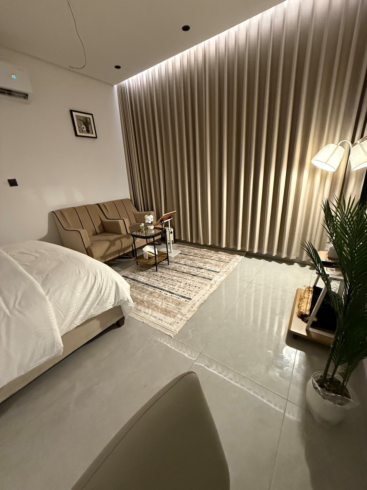 A residential studio with a high level of design and finishing, combining modern comfort and quiet luxury in an integrated space that offers a distinctive lifestyle. The room is designed in an open style, providing a sense of spaciousness, with intelligent space distribution that suits a modern lifestyle.