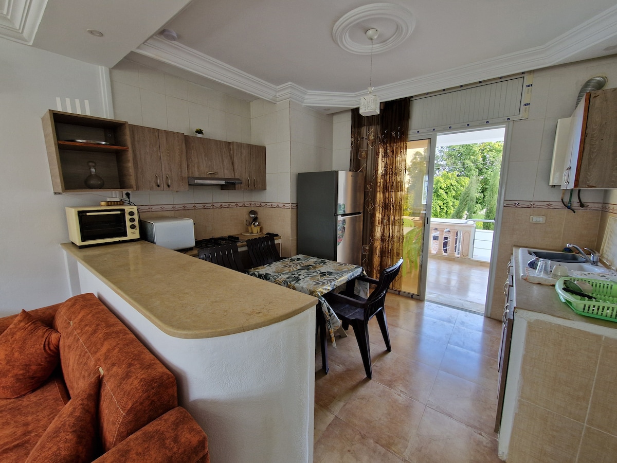 Détendez-vous dans ce charmant étage de villa climatisé en demi sous-sol, offrant une belle terrasse ainsi qu'un magnifique jardin commun. Situé dans un quartier résidentiel calme, à seulement 5 min en voiture de la célèbre plage de Kélibia et à 5 min du centre-ville, avec proximité immédiate de nombreux cafés et restaurants. Ce logement dispose d’un salon accueillant, d’une cuisine américaine bien équipée, d’un agréable coin repas et d’un espace nuit isolé comprenant deux chambres à coucher.