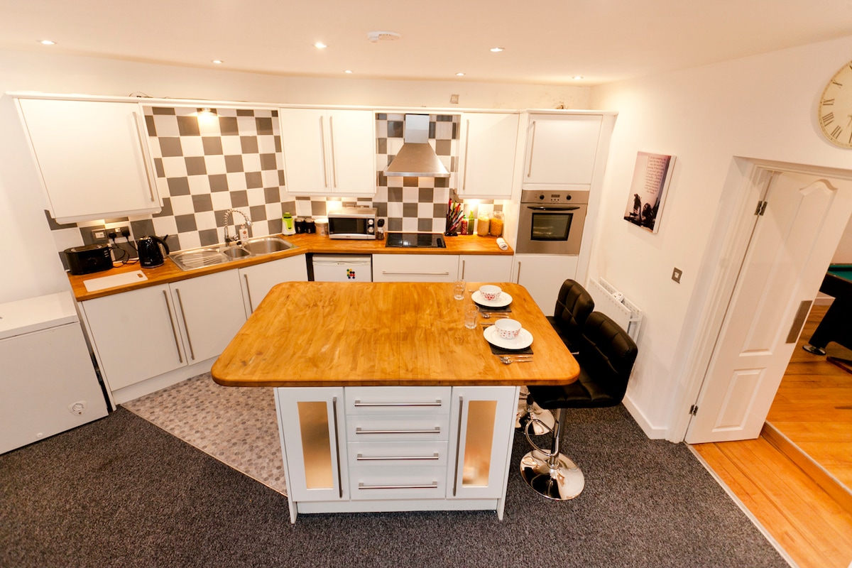 獨特的獨立式4臥室房屋-改建的Abattoir 房子有: 球桌 桌上足球桌 洗衣機+烘乾機 52吋智慧電視 PS3 -啤酒乒乓球桌 開放式廚房+島嶼/酒吧 美式冰箱 WIFI 烤箱+爐竈和顯而易見的東西 備註:沙發只是一張沙發,而不是拉出式沙發牀
