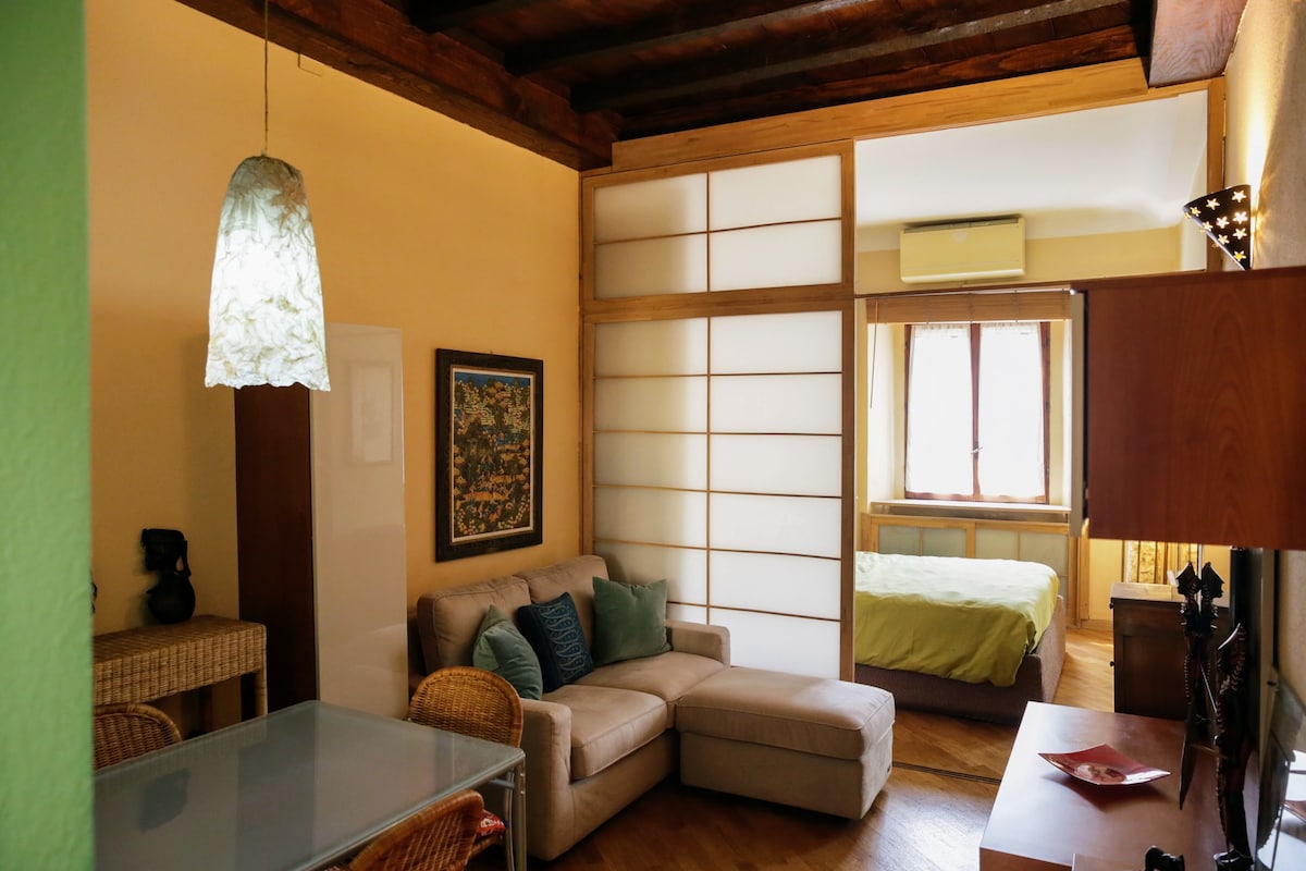 單間公寓/設計套房,位於運河旁,距離聖洛倫佐柱廊僅幾步之遙,由建築師精心翻新。位於一座豪華的建築內,俯瞰安靜而優雅的內部庭院。廚房寬敞且設備齊全,與臥房區分開。床可從單人床變成雙人床,家具為量身定制。智慧工作區、大型隱藏式衣櫃、大型窗戶浴室。空調、Wi-Fi 連線、無電視 CIN:IT015146C2GP9RRCAR