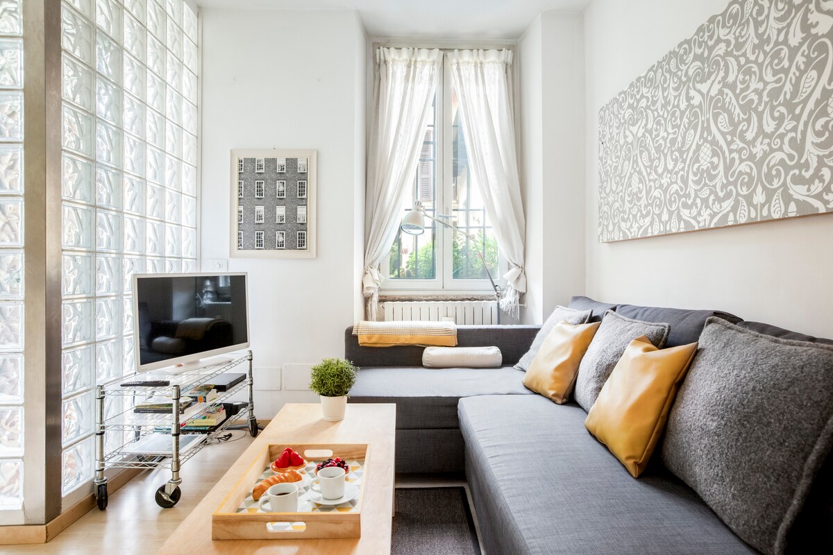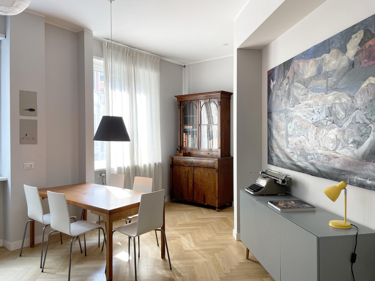 在這間設計精美的公寓中享受米蘭的生活方式。 - 天花板高 3.5 公尺 - 带有雨淋式淋浴的大型独立浴缸 - 最新一代 1Gh WiFi - 非常安靜 - 著名的古老建築 - 步行即可抵達聖 聖安布羅焦教堂、米蘭大教堂和科爾杜西奧廣場(CBD) - 66 平方米,新翻修 - 實木地板、空調 - 床鋪尺寸為160x200 - 不同高度的羽絨枕頭和 27 公分的床墊 - 內斯壓濾咖啡機(含膠囊)、水壺 - 雙層玻璃窗和室內百葉窗